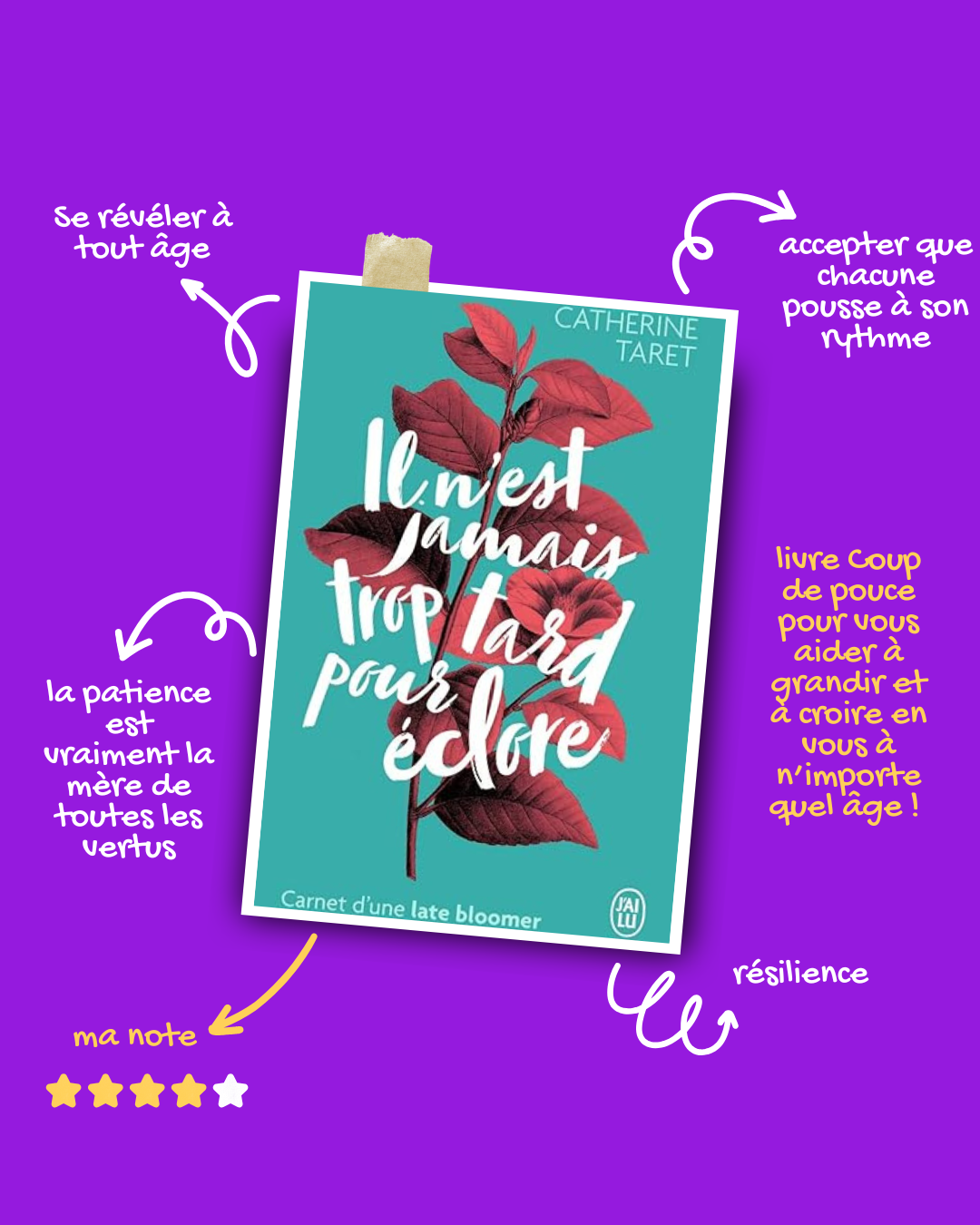 "Il n'est jamais trop tard pour éclore" est un livre de développement personnel dans lequel Catherine Taret partage son expérience en tant que "late bloomer", une personne qui se découvre et s'épanouit plus tard dans la vie.